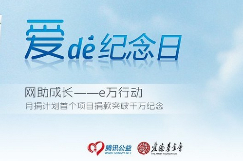 自2009年7月,爱德基金会与腾讯公益网开展月捐活动以来,已有近百万人次的爱心网友通过月捐平台向“网助成长——e万行动农村孤儿助养项目”捐助,资助孤儿超过1800名,而为纪念2011年9月30日捐助突破千万元大关,爱德与腾讯月捐共同发起“爱的纪念日”专题页面及系列活动。