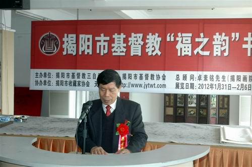 陈主席指出,基督教文化是人类文明的结晶,源远流长,表现基督教文化的艺术作品数不胜数,美不胜收,今天开幕展出的作品,可以说是这些作品中的沧海一粟,但它们是揭阳市教会弟兄姊妹们的杰作,是献给神的感恩的祭物。