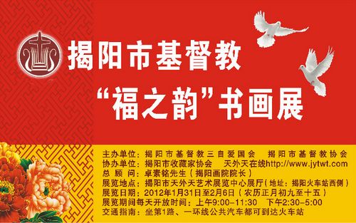 为了响应中共十七届六中全会关于“推动社会主义文化大发展大繁荣”的号召,广东省揭阳市基督教两会遵照主耶稣基督传扬和平福音的教训,特于2012年1月31日至2月6日(农历正月初九至十五)在揭阳市天外天艺术展览中心举办了揭阳市基督教“福之韵”书画展,旨在弘扬基督教文化,激发基督徒和社会各界朋友一道,为国家的繁荣祝福,为建设幸福揭阳而努力。