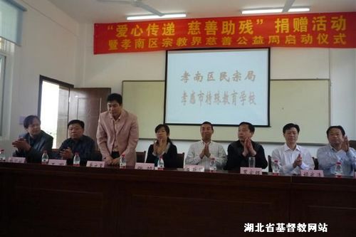 2012年4月26日上午10:00-11:00,湖北省基督教协会会长朱致国牧师一行前往孝感市孝南区,参加由孝南区民宗局倡仪并主办、孝感市城区基督教会、孝感市孝南区特殊教育学校承办、孝感市孝南区民宗局王军局长带领策划的“爱心传递 慈善助残”的捐款活动。