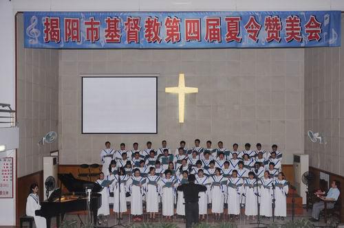 广东省揭阳市基督教第四届夏令赞美会于2012年8月14日晚上在市区真理堂举行,这是揭阳市教会一次较大规模的赞美会,由来自城区、揭东、揭西、普宁各县(市)的诗班及市基督教真光合唱团献唱,代表全市基督徒向独一真神献上赞美的心声,同时为各诗班提供一个彼此交流、共同长进的平台。