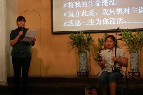 “凡有气息的,都要赞美耶和华。你们要赞美耶和华!”(诗篇150:6)为了敬拜赞美上帝,8月29日北京基督教会珠市口堂举行感恩赞美会,由程玉梅牧师证道,其中以赞美诗颂赞为主,程玉梅牧师母女献上二胡伴唱,还有一姐妹表演了手语舞蹈。
