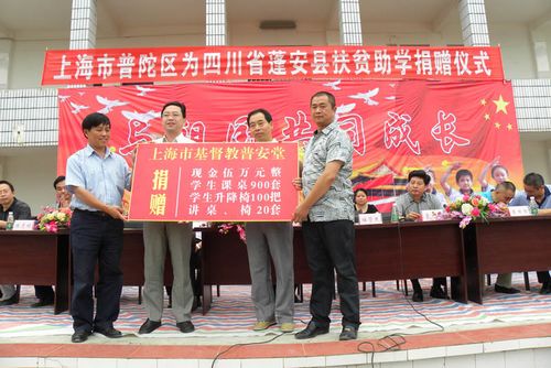 9月7日,上海市普陀区基督教普安堂集众多基督徒的爱心与奉献,向四川省蓬安县新园乡学校捐赠了900套学生用课桌椅,共计15万元。