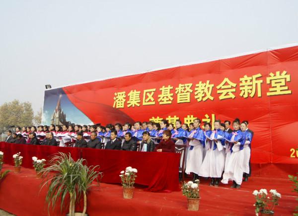 2012年11月19日上午,位于安徽省淮南市潘集区基督教堂(新城教会)举行新堂奠基典礼。来自淮南市潘集区民族宗教局领导、社区、街道领导,市基督教两会牧长、以及周边县市教会的牧师、 同工等参加了奠基典礼,现场约2000人参加,共祝新堂建堂工程顺利!