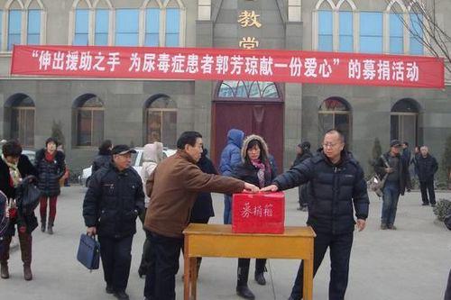 2013年1月13日,由晋城城区教会发起的“伸出援助之手 为尿毒症患者郭芳琼献一份爱心”募捐活动在教会大院内举行,来自四面八方的基督徒热烈响应,纷纷为这位素不相识的患者献上自己的一份绵薄之力。