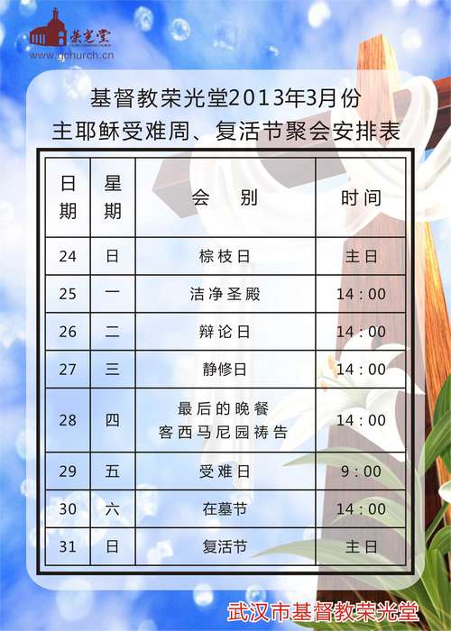 武汉市基督教荣光堂2013年受难周、复活节聚会安排2013年复活节是3月31日。3月24日是棕枝主日,从24日到30日是受难周,基督教会有纪念受难周的传统,一般每天都会安排一些活动,借此一起默想主耶稣的受难和复活。