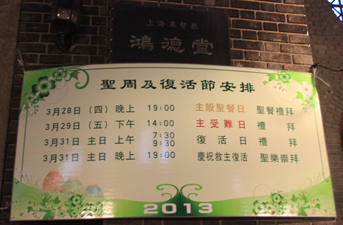 据上海市基督教鸿德堂公布的信息,教会传统上的复活节临近之际,鸿德堂于受难周至复活节期间安排了四场聚会: