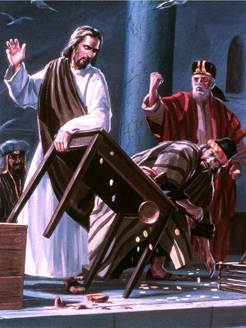 耶稣进了神的殿,赶出殿里一切作买卖的人,推倒兑换银钱之人的桌子和卖鸽子之人的凳子;对他们说:“经上记着说:‘我的殿必称为祷告的殿,你们倒使它成为贼窝了。’”(太21:12-13)