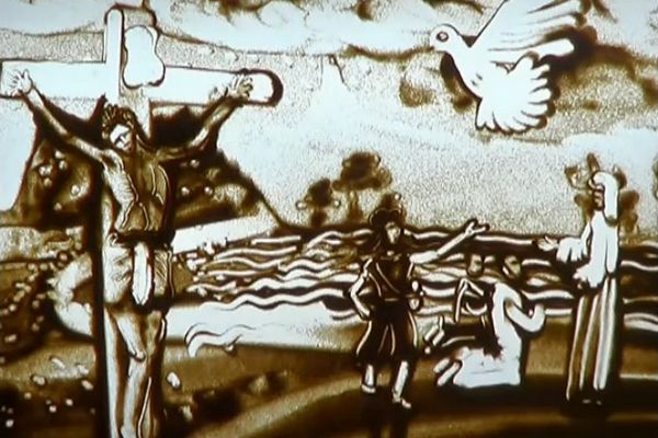 复活节即将来到,世界各地的基督徒都在用各种方式预备迎接主的复活,天津圣彩文化创意有限公司的刘圣彩老师,应温州教会复活节活动策划要求,根据黄国伦老师演唱的《Shalom,平安》,创作了沙画作品《耶稣受难记》。沙画作品由刘老师的学生李锋弟兄制作完成。