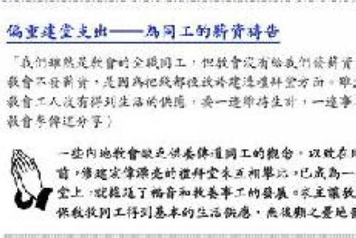 神州情近日发布了最新的代祷之页,在这次的六项代祷题目中,有一项就是关于传道人薪酬问题。