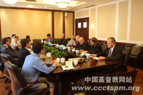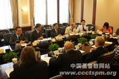 中国基督教协会会长高峰牧师介绍了中国基督教两会的部门设置及开展的事工,并重点介绍了中国教会的三个特征及中国教会发展的近况和面临的挑战,同时回应了客人提出的一些问题。
