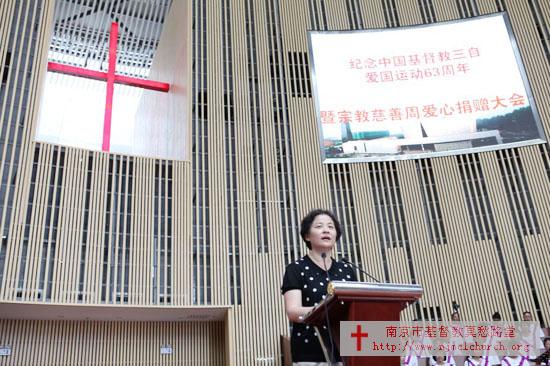 “今天,大家能在这所现代化的教堂里开展纪念活动,就是对63年来南京基督教发展最美好的见证。实践证明,三自爱国运动是中国基督教历史上最具里程碑意义的重大创举,它所开辟的独立自主、自办教会的道路是完全正确的,已经成为爱国爱教精神在基督教领域的成功实践。在发生汶川大地震、玉树地震、舟曲泥石流等突如其来的特大灾难时,南京基督教界总是在第一时间组织募捐、第一时间送去关爱和温暖,充分展现了大爱无疆的美德。今年所有募捐的慈善款全部定向捐赠给省残疾人福利基金会,用于给特困残疾人家庭购买彩电和洗衣机。市基督教两会是全市五大宗教中最早开展宗教慈善周动员部署的宗教团体,慈善周工作开展的有声有色,除了募捐,还开展了形式多样的爱心奉献活动,再次阐释了南京基督教界关爱残疾人、帮助弱势群体的大爱精神。慈善事业是一项传播爱心、传递幸福的崇高事业,让我们以宗教慈善周活动为契机,团结一致、凝心聚力,共同开创我市基督教工作的新局面!”李兰局长说到。
