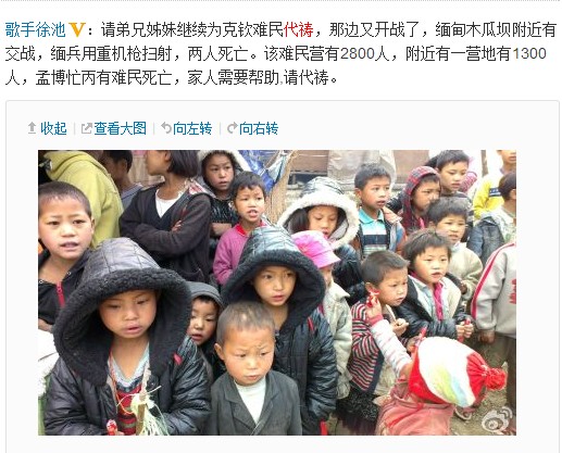 尽管一个月前缅甸克钦独立武装与政府达成停火协议,局部冲突仍存在,人民饱受战火蹂躏。“那边战争又开始了。”福音歌手徐池近日微博呼吁,“请弟兄姐妹继续为克钦难民祷告。”