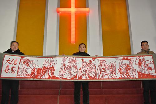 著名剪纸艺术家田素良牧师,2014年2月16日制作出四米长卷“大喜信息耶稣降生”的剪纸。剪纸内容:传神旨、探亲戚、报喜信、主降生、朝君王、赴埃及、回故乡等七个方面。展现了耶稣降生的形象画面,惟妙惟肖,栩栩如生。