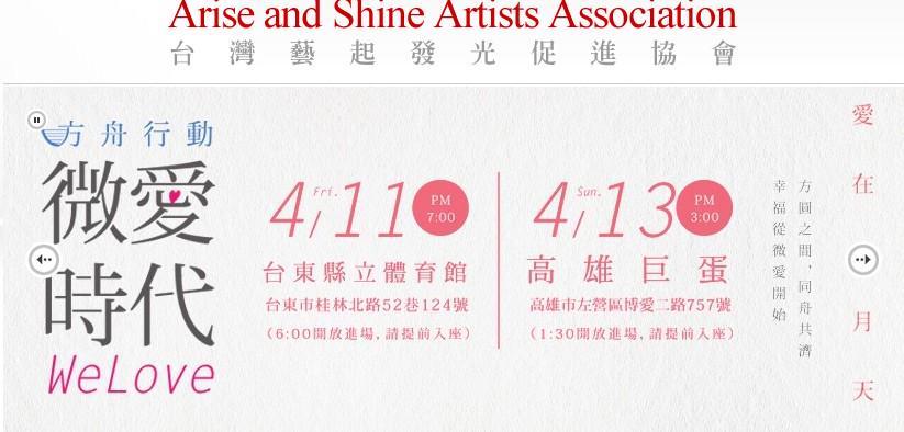 目前,“艺起发光”的网站首页上,已登出了两张海报,主题为“方舟行动,微爱时代”——方圆之间,同舟共济,幸福从微爱开始。并公布了两个时间和场次:4月11日晚上7:00(PM)于台东县立体育馆,以及4月13日下午3:00(PM)在高雄巨蛋。这可能是2014年爱在四月天的主题及活动时间,但网站却没有具体说明。