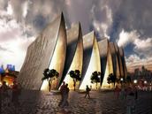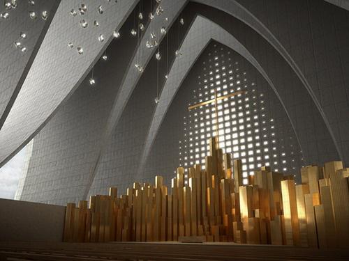 该建筑由一系列带褶皱的混凝土拱组成,戏剧性与工艺性交融,除了外观看上去非常辉煌,它的每一个折叠拱之间都镶有透明玻璃幕墙,加上教堂朝向南北开放,室内光线始终充足,一方面显得非常环保,同时让人身处教堂当中,也有更多的神圣感觉。