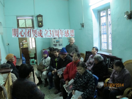 2014年3月11日,“明心”团契举行了成立31周年感恩聚会,聚会人数将近30位,其中盲人的弟兄姐妹有20位左右,还有芳村堂的教牧同工、长老、执事、干事等人。