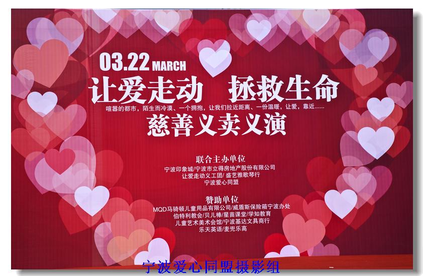 2014年3月22日,“让爱走动 拯救生命”慈善义卖义演活动在宁波印象城顺利闭幕。本次活动持续八小时,爱心工作人员一共募集资金127455.6元,所得款项将用于支持尿毒症患者林晨阳家庭的医疗开支。