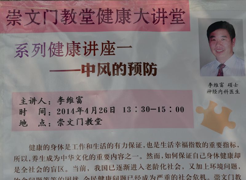 本周六(4月26日)13:30至15:00,北京崇文门教堂将举办健康讲座,特邀神经内科医生李维富硕士讲解“中风的预防”。