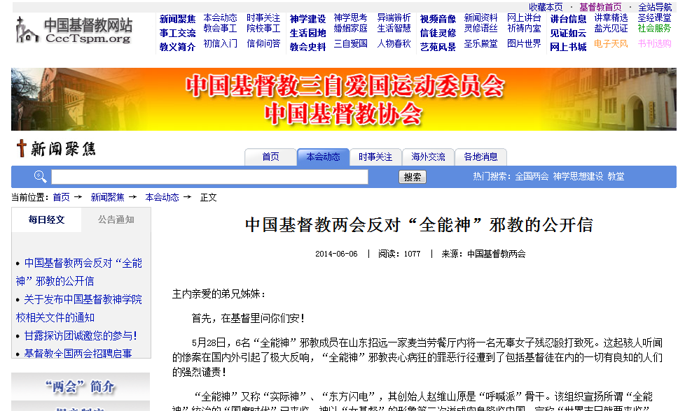 5月28日山东招远“全能神”邪教故意杀人案自发生后便引来各方关注。6月6日,中国基督教两会通过官网发布《中国基督教两会反对“全能神”邪教的公开信》,对此事做出公开回应。