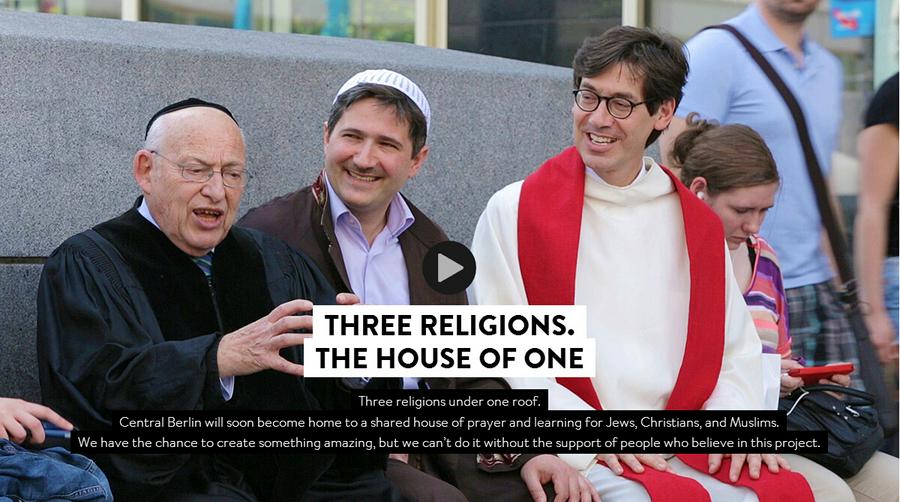“世界首座基督教、犹太教和伊斯兰教三教合一教堂在德国首都柏林开建。教堂名为‘The House of One’,三教代表各持一块砖,在工地举行“每人捐赠一块砖”启动仪式。教堂共需400万块砖,一块砖价格为10欧元,全部来自民众在线捐赠。”