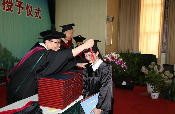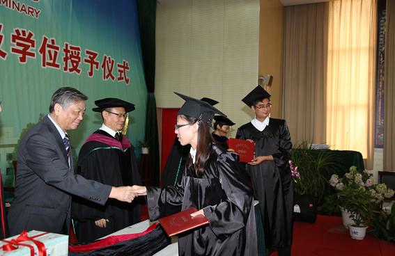 学位授予仪式环节,陈逸鲁牧师宣读了2014届毕业生名单;教务处林曼红牧师主持毕业证书和授予学位的唱名,高峰院长、陈逸鲁常务副院长共同为学员颁发了毕业证书和学位证书;傅先伟长老、潘兴旺牧师与毕业生一一握手祝福。