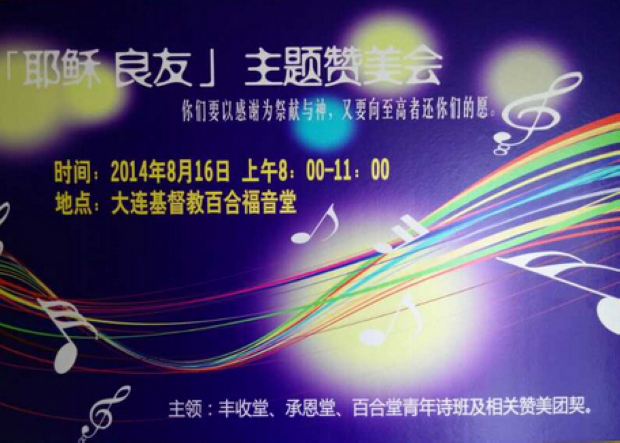 8月16日(周六)8点到11点,大连基督教多个青年诗班将联合举办主题为“耶稣良友”的赞美会。