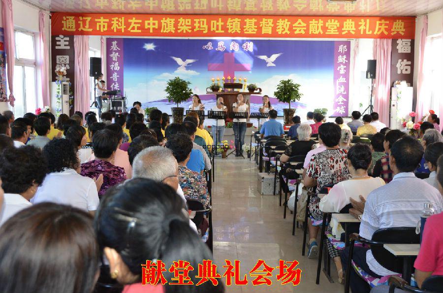 那里是内蒙古科左中旗架玛吐镇,所建成的教堂是一幢一层的房子,教堂正门口横匾上写着“耶稣爱你”四个大字,上面竖立着一个大大的红色的十字架。讲台以一个竖立的十字架为背景,上面写有“以马内利”四个字,旁边配有两只象征圣灵的鸽子。讲桌的背后还设有7个金灯台。