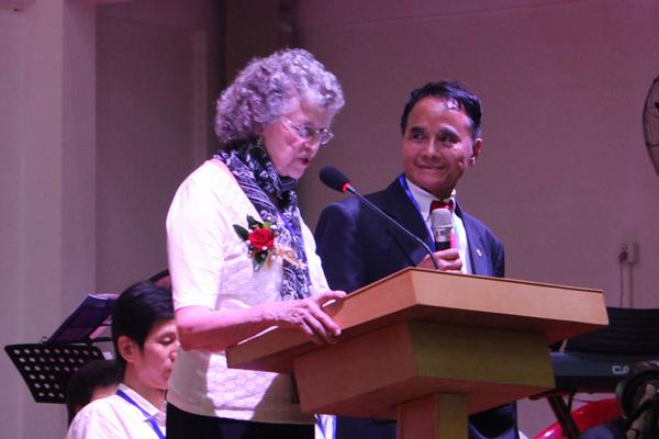 值得一提的是,福建教会历史上曾经到福州、福清宣教的美国传教士柯志仁牧师后人毕乐华女士亦专程从美国来到庆典现场。其祖父曾在福州宣教,不仅对教会做出很多贡献,亦对当地的教育及医疗事业做出巨大贡献。毕乐华女士首先以“平安”问候大家,并感谢大家的热情。