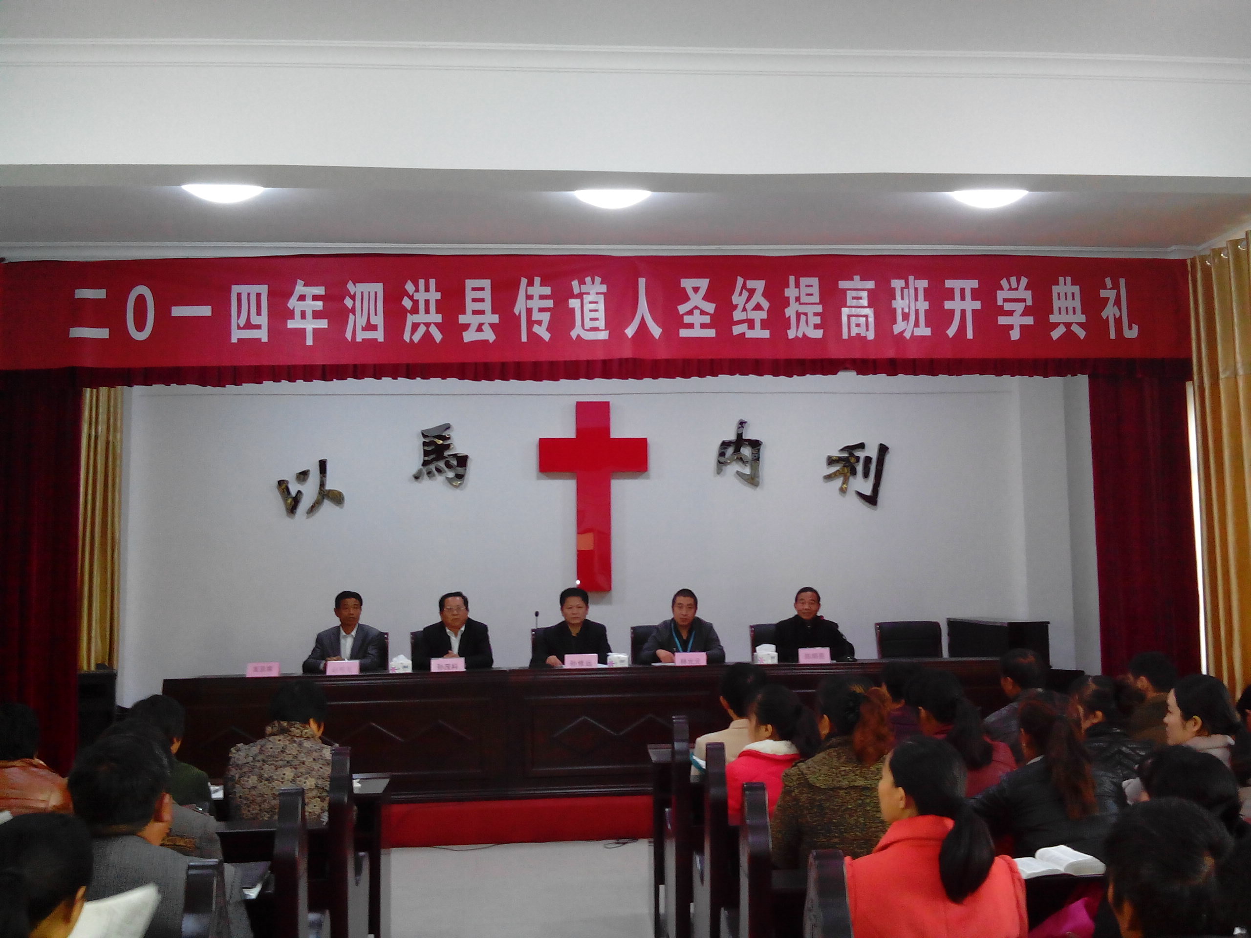 江苏宿迁泗洪县2014年传道人圣经神学提高班于11月4日上午,在江苏神学院泗洪校区举行开学典礼。泗洪县委统战部副部长孙修远、县基督教三自会主席孙茂科,以及来自全县各乡镇堂点的60多位学员和神学院部分老师代表参加仪式。