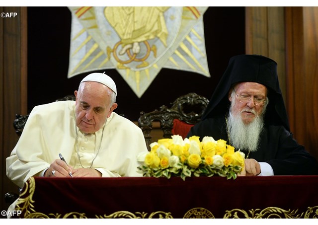 据梵蒂冈电台消息,11月30日,方济各在土耳其伊斯坦布尔市出席了东正教普世基督教礼拜仪式,之后,教宗方济各和东正教巴尔多禄茂宗主教举行会谈并签署声明。两位领袖坚决地再次肯定,愿意“继续同行,怀着爱和信任”,超越至今仍使两个教会分裂的阻碍。“我们都诚恳而坚定地愿意服从我们的主耶稣基督的旨意,努力促进所有基督徒之间、尤其是天主教徒和东正教徒之间的完全共融”。