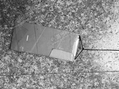 韦某用的偷钱“神器”是用一条型号正好的小钢板为主体,涂上双面胶用来粘钱,再用绳子系上。