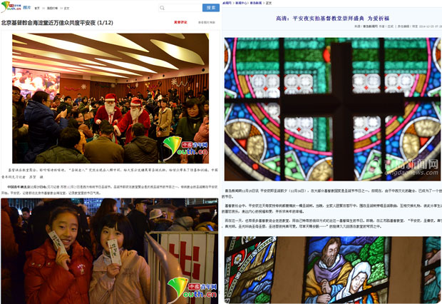 近年来,伴随着圣诞节越来越受中国人的欢迎,各地主流媒体也开始关注基督教堂圣诞节的活动。今日早上,北京、青岛、镇江等地多家媒体报道了当地教堂平安夜活动的情况。