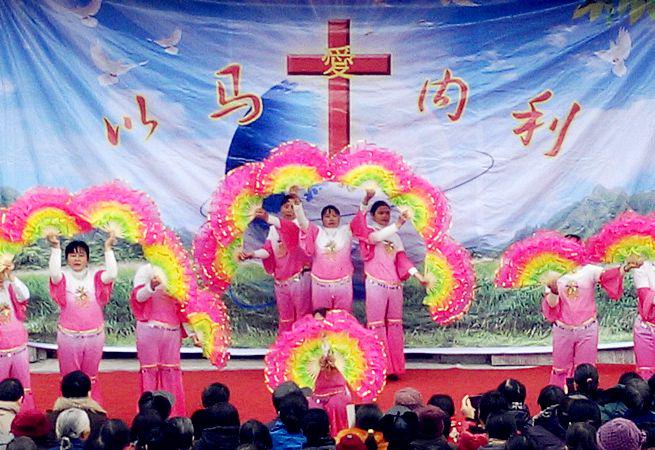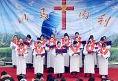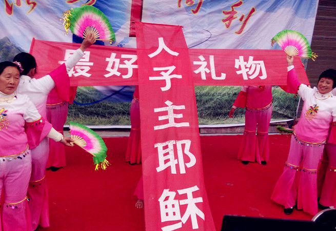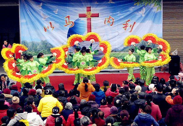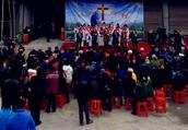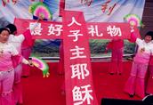 献堂典礼过程中,弟兄姐妹们再佳慧院子中搭建的建议舞台上,表演了多种精彩的节目。在一个舞蹈节目上,几位姊妹手拉两条横幅,横竖交叉成一个“十字架”形状,上面分别写有“最好的礼物”、“人子主耶稣”。