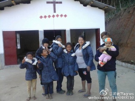 据基督徒艺人、爱基金主席蒋丽萍微博介绍,“1/云南德宏州陇川山上冰雹,第二天清早还没有化完,农作物及简单帐篷受损严重。 2/看见孩子鞋子都没有穿的,这羽绒服可以给他们暂时的温暖。 3/爱基金及时送给云南山区的200件御寒衣物,让神的爱温暖着他们。那份踏实的感觉是那么安稳,那么喜乐。感谢神。”