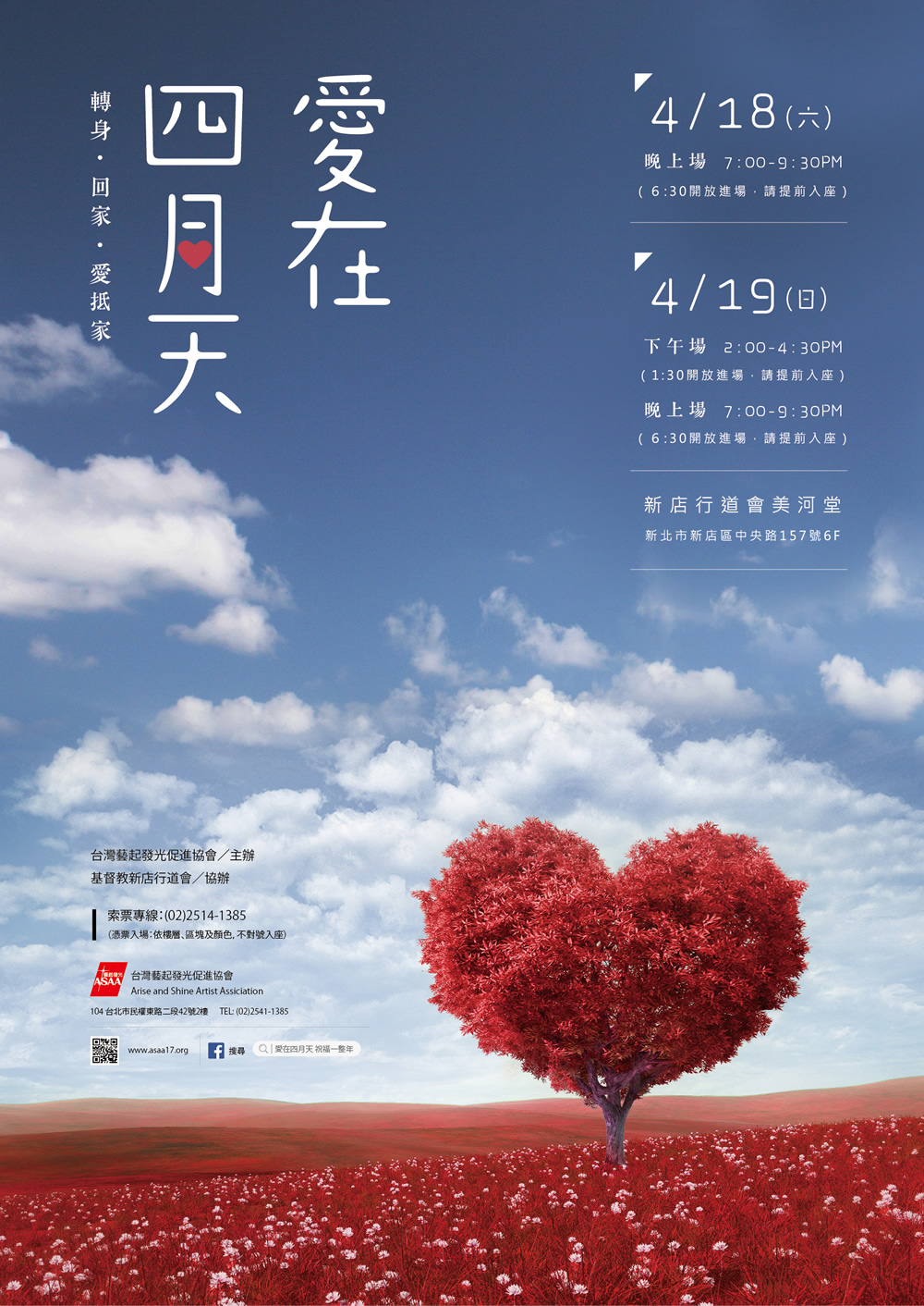 据台湾艺起发光促进协会网站消息,2015年爱在四月天将于4月18日及4月19日连续举办三场,此次关注的是“转身·回家·爱抵家”,地点为新店行道会美河堂。
