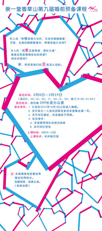 据海报消息,此次预备课程针对的计划在2015年10月1日之前进入婚姻的弟兄姐妹,课程于4月10日开始,12日结束,地点为杭州磐石堂。本期课程包括营会和营会后两个部分,食宿自理。