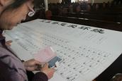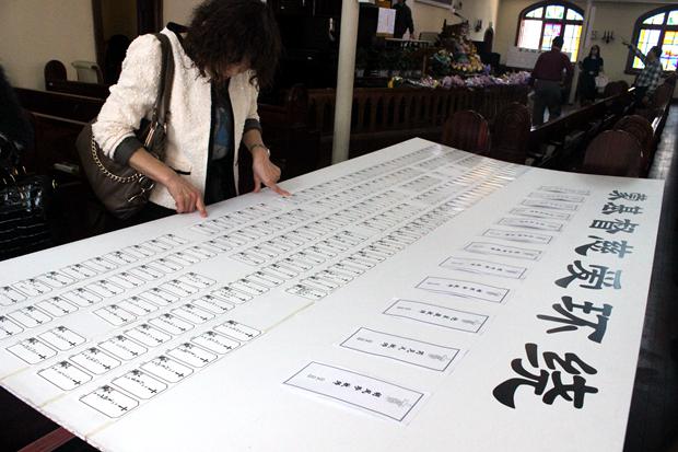 的确,笔者一进到景灵堂,就发现教堂圣台前醒目地摆放着两块白板。两块白板上分别写着“蒙基督慈爱环绕”、“享天国永光照耀”。白板上则写有500多个方块纸贴成的“牌位”——每一张纸片都是一个墓碑的形状,上面画有基督教特有的十字架标记,“十字架”下面则是已过世的人的名字。前来追思的人们,纷纷在白板上找自己熟悉的名字。这500多个名字被前来追思他们的信徒们带来的鲜花簇拥着。