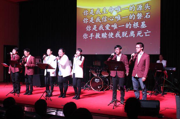 书画社则为敬拜团题字“扬声颂赞”,一位青年男高音歌唱家带来了舒伯特的《圣母颂》,伴着古典优美的钢琴曲,弥漫着异国情调。金陵文学社则带来了诗朗诵——诗人食指的诗歌《相信未来》。