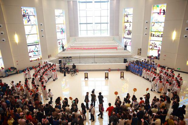 4月25日,一场“共筑天河堂.齐心来奉献”赞美会在广州基督教天河堂举行,来自广州市的基督徒约600人参与。即将完工的天河堂将成为广东省最大礼拜堂。