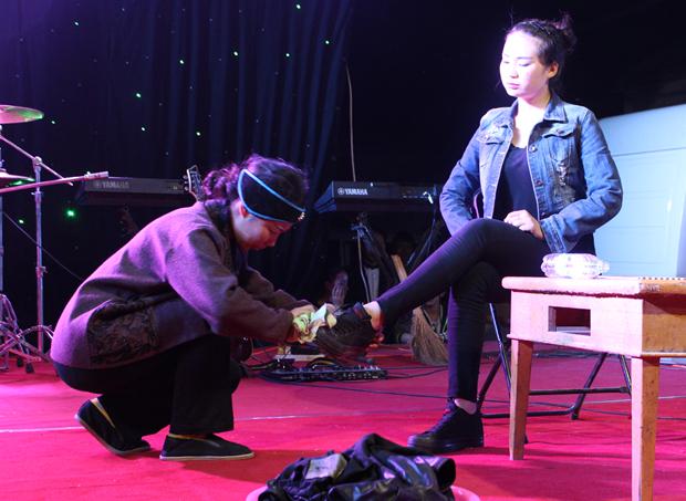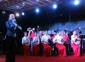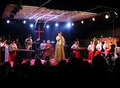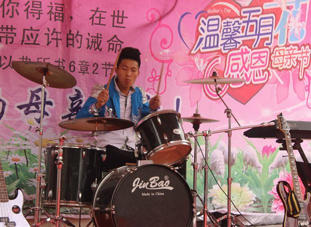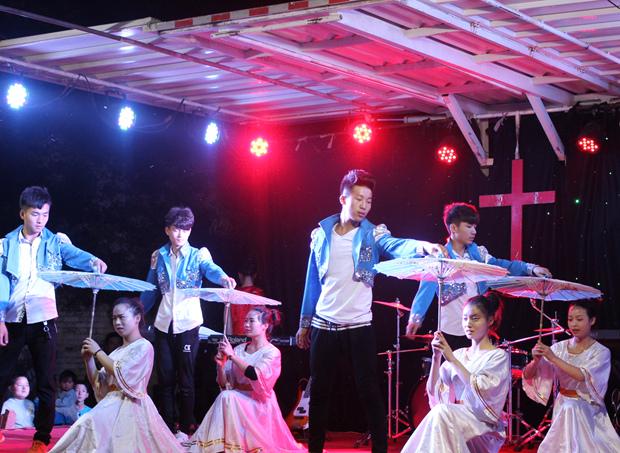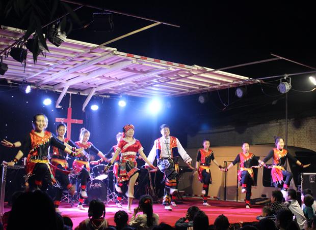 在教会前街道舞台车展开的舞台上,歌伴舞《黑加白》、葫芦丝演奏《月光下的凤尾竹》、倡导孝敬的小品《婆婆也是妈》、萨克斯加独唱《差遣我》、大型舞蹈《主爱中国也爱这地》、爵士鼓表演等节目一一呈现在观众面前。