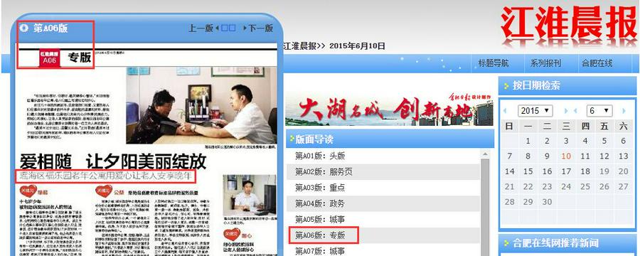 《江淮晨报》以“爱相随,让夕阳美丽绽放”为题,用整版报道了瑶海区福乐园老年公寓的情况,称赞其“用爱心让老人安享晚年”。(原文链接)