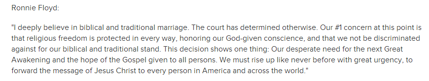 美南浸信会在官网发表声明称不支持同性婚姻,罗尼·弗洛伊德说:“我深深相信圣经和传统婚姻。法院已经做出了其他的决定。此时此刻,我们最担心的是宗教自由是否在任何地方都受到保护,来尊荣神赋予的良心,并且我们不歧视我们圣经和传统的立场。这个决定显示出一个事实:我们迫切需要下一个大的属灵觉醒,以及向着所有人的福音的盼望。我们必须带着前所未有的紧迫性,站立起来,来向所有美国人和世界各地的人宣讲耶稣基督的信息。”
