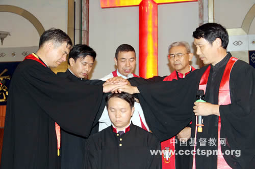 朱牧师等五人行按手礼,通山县基督教会贺赏赐同工按立为牧师,通山县基督教会郭素霞同工按立为教师。