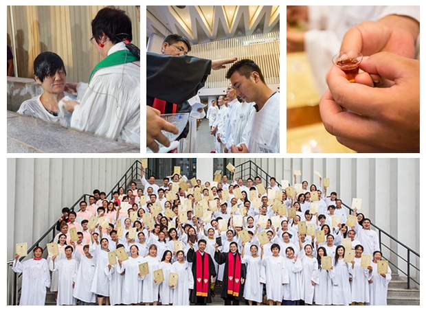 洗礼结束后,观礼的人与受洗者一起鼓掌庆祝这一喜庆的时刻,施洗的牧者与所有受洗者合影留念。
