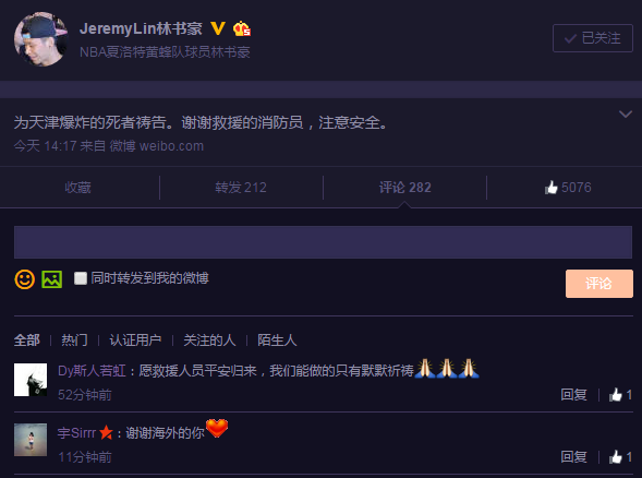 爆炸之剧烈引发全国关注。刚在北京结束“天下华人•共同筑梦”公益晚会的林书豪发微博为受难者祷告,并感谢消防员们。
