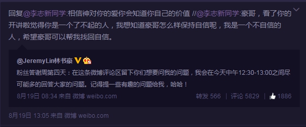 林书豪在粉丝答谢周第四天回答网友提问。当被问到“如何找回自信”时候,林书豪鼓励对方“相信神对你的爱”。