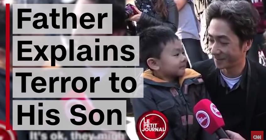当众人用各种方式表达对巴黎的关注时,一个1分多钟的视频受到网友的关注,并在社交媒体上得到大量转发。在这个视频中,一对父子接受采访:儿子非常担心,父亲抚摸着儿子的头,告诉他我们可以用鲜花来战胜恐怖分子手中的枪。