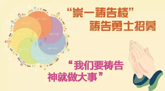 我们要祷告,神就做大事。近日,杭州崇一堂“崇一祷告楼”事工发出招募公告,希望信徒更多的参与到祷告中来。该事工的异象是成为“人人参与的楼、万民祷告的殿”。