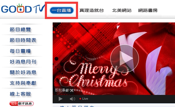 据http://www.goodtv.org/发布的节目预告显示,12月24日晚19:00-20:30,“一台直播”频道将在线播出“空中英语教室——欢庆圣诞音乐晚会”。而据基督教论坛报介绍,该圣诞晚会由《空中英语教室》创办人彭蒙惠率教师群与天韵合唱团举办。该圣诞晚会在台湾巡演八场,共带领1291人决志信主。(直播地址:http://www.goodtv.org/)。